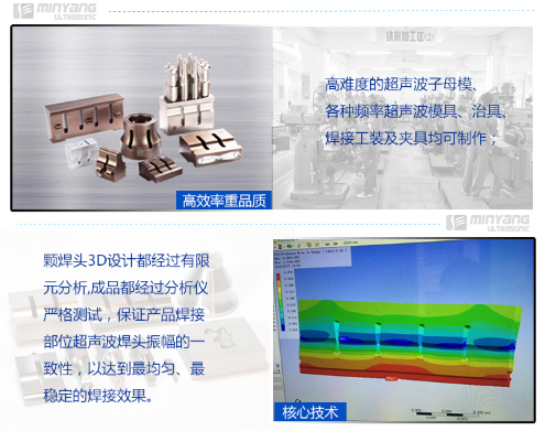 正规超声波模具生产商进料都有一套严格地检验程序,加工尺寸都是经过计算机软件模拟和校验后加工出来的。品质才有保障,这些工序一般作坊是无法做到的,如不经过合理地设计,做出的模具,在焊接小工件时,反应问题还不明显,当大功率时就会出现各种弊端。严重时直接损坏功率组件。铭扬公司所出厂的每套超声波模具都经过严格选材和有限元分析3D设计制作而成,充分保证了产品焊接部位超声波焊头振幅的一致性,达到产品焊接均匀稳定的效果。