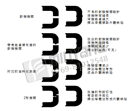 (a)焊接前的z接头: (b)焊接后的z形接头:(c)改进的z形接头:台阶附带肩部掩盖了不平性,结果使外观改进