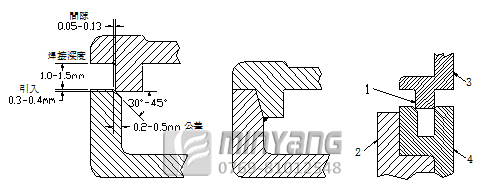 1-槽舌剪切接头:有助于阻止部件向内弯曲;2-支撑夹具:目的是在焊接过程中阻止下面部件壁向外弯曲;3-上面的部件;4-下面的部件