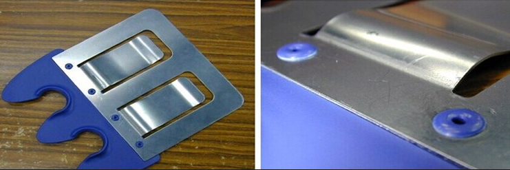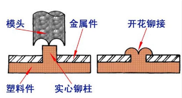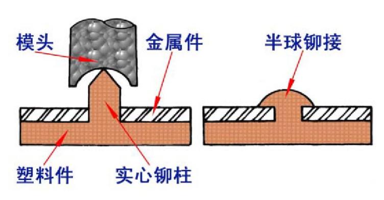 金属与塑胶铆接原理:塑胶件上的塑料柱,穿过金属件的孔,热熔头(热熔铆接)/超声波焊头(超声波铆接)将塑料柱突出部分熔融,按照设计的铆接形状变成铆钉形状,使金属与塑胶材料机械铆接在一起,将金属板固定住。金属与塑料热铆接组装是简单、低廉、高效、简易的性固定装配的有效方法。在型模作用下延展再成型,多点同时进行铆接固定,无须外加零部件、填料和其它费用,热塑性材料依此方法装配牢固、紧固又坚固。简而言之,组件上的所有各个紧固部位同时加热塑化,然后用激冷模头施压后使其延展变形、冷却成形铆固,许多部件组合成牢固的整体组件,事实证明优于其它常用的传统方法,无须其它填充材料,明显减少材料消耗、降低成本。