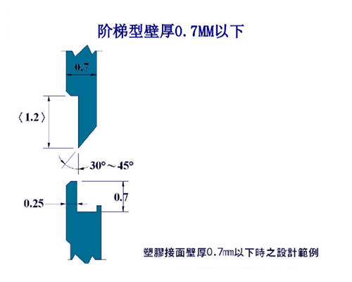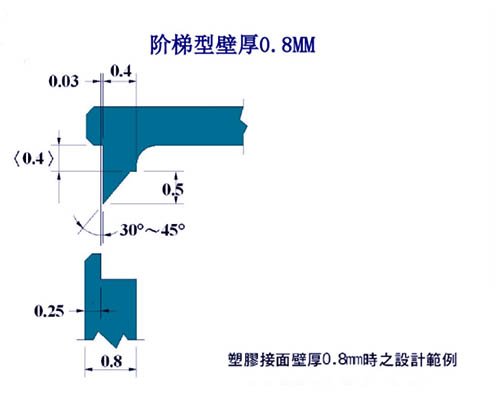阶梯尖式:适合水密性及防止外凸或龟裂之方法,接触面的角度= 45°,x=w/2,d=0.3~0.8mm为佳。