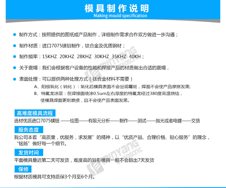铭扬超声波模具制作采用CNC电脑精雕,数控机床等精密机械设备加工,精选优质进口航空镁铝高品质钛合金棒及钨钢白钢等材料,我们公司除了拥有20多年经验的制作团队,还有检测设备,可定制高难度的超大型超声波模具,超声波子母焊头,超声波穿刺焊头等焊接工装及夹具,每个超声波模具都经过有限元模拟分析,成品都经过分析仪严格测试,让其能与整个振动系统结合,保证产品焊接部位超声波模具振幅的一致性,以达到均匀稳定的焊接效果。
