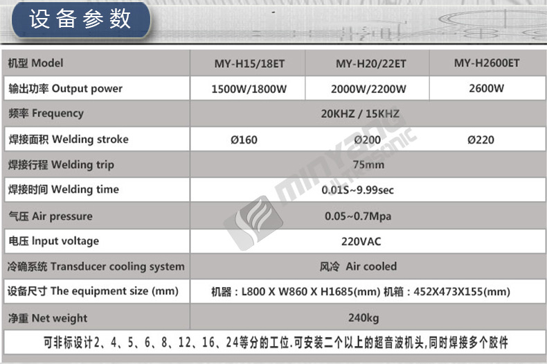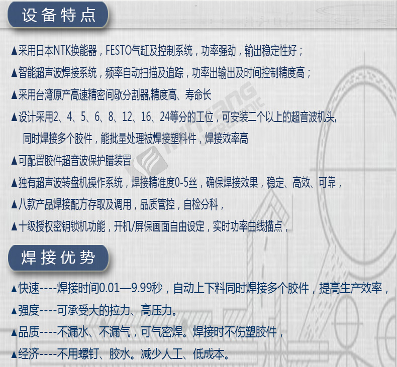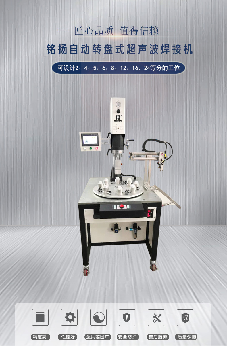 铭扬自动转盘式超声波焊接机,采用台湾原产高速精密间歇分割器,精度高、寿命长 设计采用2、4、5、6、8、12、16、24等分的工位 焊接时间0 01—9 99秒,不需要人工拿放,不停机,提高生产效率可安装二个以上的超音波机头,同时焊接多个胶件,生产率高适用于, ABS、PC、PP、POM、GS、透明硬胶、尼龙、环保盒PP、CD袋、PVC工具袋等。