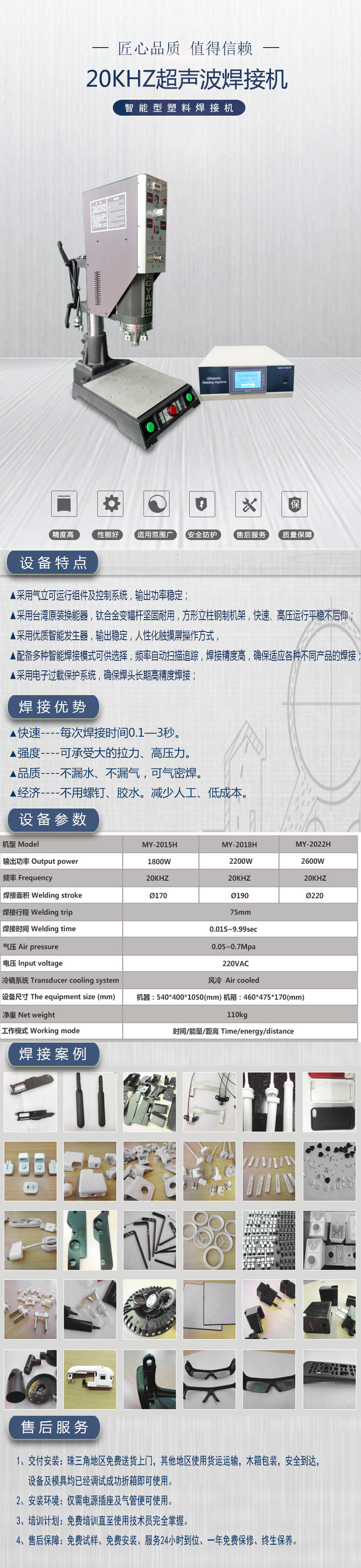 原装进口换能器,钛合金变幅杆坚固耐用,输出功率强劲稳定;台湾线路,稳定高效;钢制机架,快速、高压运行平稳不后仰;超载保护系统,有效保护设备主要部件及控制系统的损坏;采用IC全晶体自动回路,频率自动追踪,精确度高;电动升降,调节轻松快捷;