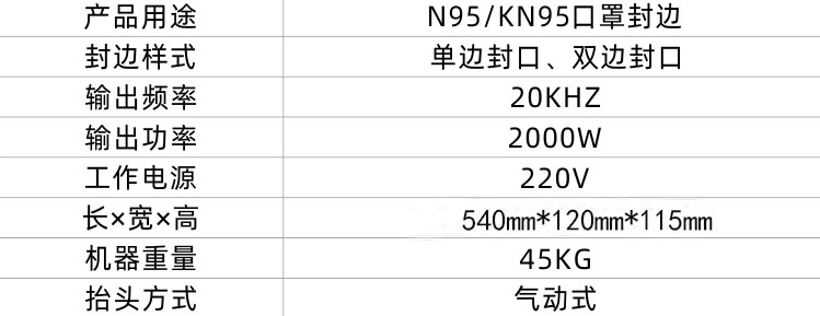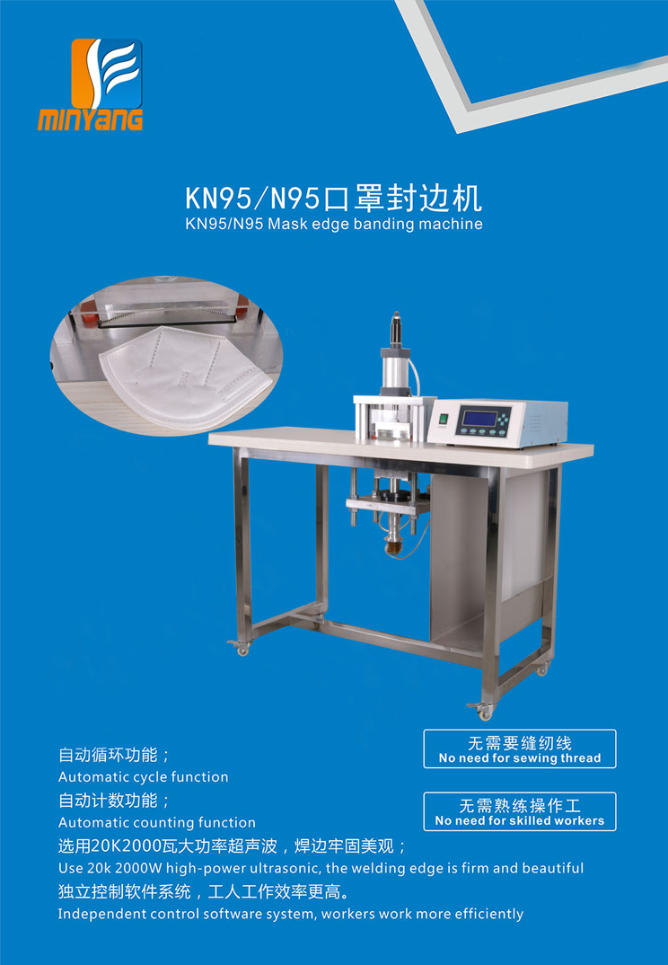 铭扬超声波KN95口罩封边机,脚踏式超声波封口机、超声波口罩封边机,是本厂2020年为疫情所需研发制造的新款产品,自主研发设计,操作简单具有封边牢固美观快速、设备万向轮设计,轻巧方便移动、寿命长等特点,是制作N95、N94、KN95、KN94口罩封边的理想设备。